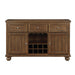 The traditional styling of the Tigard Collection lends timeless appeal to the look of your casual dining space. With subtle hints nodding to the Arts and Crafts design movement, the server features classic lines that solidify the versatile aesthetic of the collection. The server has drawer and behind door storage allowing for quick and convenient access to your decorative tabletop items as well as a wine rack and stemmed glassware rack. A traditional cherry finish is utilized to highlight the collection’s acacia veneer. 58 x 18 x 36.5H