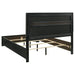 Introduce a little bit of glam flair to your bedroom with a modern upholstered bed. Featuring padded white fabric panels, the headboard is complete with molded trim and a horizontal stripe that glitters in the light. A matching vertical stripe on the low footboard is the perfect complement. A white finish is lightly textured on the panel footboard and rails, while trim is smooth and cool. The bed is complete with slats and center legs for added support and requires a foundation.