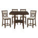 Create a cozy and inviting dining space with this stylish 5-piece counter height dining set. Crafted from Mindy wood veneer, solid wood, and engineered wood with a rich dark brown finish, this set includes a counter height table and four matching chairs. The table features a convenient open shelf for storage or display, while the chairs offer comfortable seating with beige textured fabric upholstered cushions. Perfect for casual meals or entertaining, this set comfortably seats four and adds a touch of warmth and elegance to any kitchen or dining area.