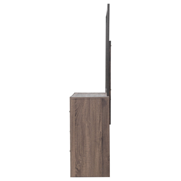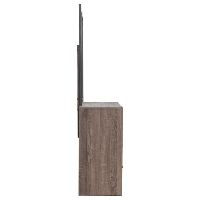 This dresser and mirror set offers a blend of modern design and practical storage. The six-drawer dresser provides ample space for clothing and essentials, while the matching mirror enhances depth and brightness in any room. Crafted from engineered wood with a durable laminate veneer, this set is built for long-term use. Matte dark bronze handles contrast against the sleek frame, adding a refined touch to its contemporary aesthetic. Key Features: • Dresser and mirror set with a sleek, modern silhouette and clean lines • Barrel oak finish enhances the warm, natural wood grain aesthetic • Six spacious drawers provide ample storage for clothing and essentials • Sturdy engineered wood construction ensures lasting durability • Matte dark bronze handles add a stylish contrast to the frame • Durable laminate veneer resists scratches, stains, and everyday wear