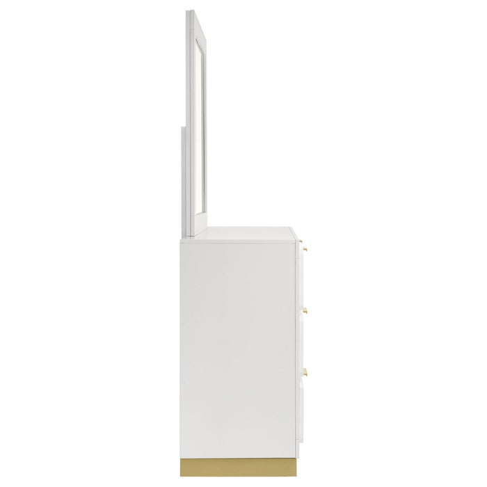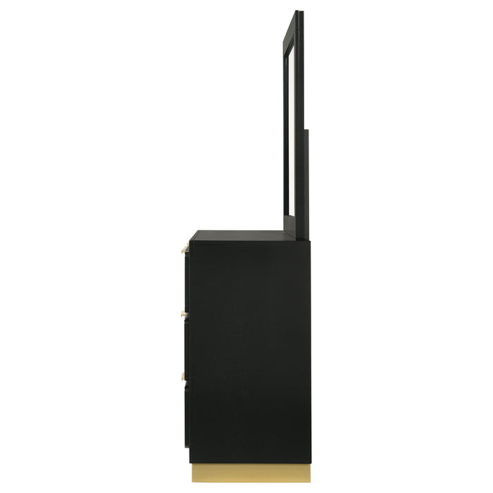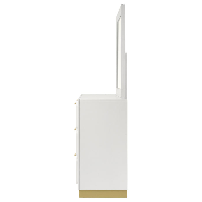 Unveil the essence of minimalism and modern luxury with our sleek six-drawer dresser and matching mirror, a perfect addition to both master and guest bedrooms. The clean lines and Mid-Century Modern flair of the dresser blend seamlessly with its straight handles and matching base, offering spacious storage with a refined aesthetic. Its smooth center glides ensure functionality without compromising on style. The accompanying mirror, framed with the same care and precision, extends the look upward, adding height and elegance to your space. This duo, versatile and sophisticated, pulls together a statement-making ensemble that transcends style trends with enduring simplicity. Key Features: • Six-drawer dresser with Mid-Century Modern design in wood and wood products • Clean lines, sleek elegance with straight drawer handles and matching base • Smooth operation with center drawer glides • Minimalist rectangular mirror with medium-thick border for added elegance • Versatile design, perfect for mounting above dressers or vanities