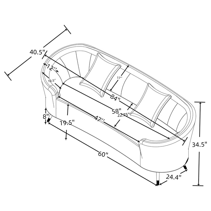 Show off your curve appeal with this updated kidney silhouette that blends fresh appeal and timeless elegance in a modern loveseat. This great piece, featuring soft, neutral beige upholstery, is perfect to float in the center of a room as an attractive focal point. The loveseat's curvy profile is complete with a rounded back and arms with a sloping design, framed by extra wide channel details, lending a sense of sophistication in a den or living room. A pair of premium filled accent pillows featuring a wide corduroy stripe and plum textured boucle offer impeccable comfort for lounging. The loveseat stands on stylish tapered black powder coated metal legs, providing a lovely hint of vintage character and airy height. Key Features: • Show off your curve appeal with this modern loveseat, perfect for a living room or den • Features a rounded back design and kidney-shaped bench seat for a sophisticated look • Upholstered in a soft and welcoming neutral beige fabric • Includes premium filled accent pillows with a wide corduroy stripe and plum textured boucle for added comfort • Stands on stylish tapered black powder coated metal legs for a touch of contrast